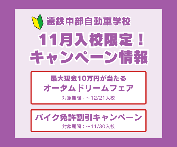 株式会社遠鉄自動車学校(以下「当社」といいます)が主催する「オータムドリームフェア」(以下「本キャンペーン」といいます)にご応募の方(以下「応募者」といいます)は、以下をよくお読みいただき、ご同意の上、ご参加ください。本キャンペーンにご参加された場合には、本規約に同意したものとみなします。【キャンペーンについて】●本規約は本キャンペーンの参加者と当社との間の本キャンペーンに関わる一切の関係に適用されます。●本キャンペーンへの応募にあたり参加者の氏名、教習生番号等を正確に提供していただく必要があるため、提供いただいた内容の全部または一部について虚偽、誤記または記入漏れがあった場合には、本キャンペーンの対象外となることがあります。●本キャンペーンは、都合により予告なく内容を変更したり、中止・終了したりする場合がございます。●当社は必要と判断した場合には、応募者に予告なく本規約を変更することができるものとします。●現在実施中の他のキャンペーンとの併用は可能です。ただし、現金プレゼントが当選された方は他のキャンペーンのプレゼント金額と併せて最大10万円となります。【本キャンペーン実施概要・参加条件】●対象入校期間:2025年10月21日(火)から2025年12月21日(日) ●対象期間中にお申込みいただいた場合も、ご入校日が対象期間外の場合は本キャンペーンの対象外となります。●本キャンペーンのご応募は対象入校期間中に遠鉄自動車学校グループ6校に通学でご入校いただいた方に限ります。 ●ご入校をキャンセル、もしくは対象入校期間外に変更された場合は本キャンペーンの対象外となります。【応募方法】①Webサイトもしくは、店頭で入校お申込み ②本キャンペーン期間内に入校 ③ご入校日に自動車学校から配布またはLINE配信するアンケートコードから希望の賞品を選択して応募完了!【抽選】●2025年12月下旬に厳正な抽選を行ない、当選者を決定いたします。【当選・賞品進呈】●当選された方には、2026年1月上旬に株式会社遠鉄自動車学校よりメールにて、当選のご連絡と賞品に関するご案内をいたします。●当選連絡は「license-school@entetsu.co.jp」よりお送りします。ドメイン設定(受信拒否設定)をされている場合、当社からお送りするメールが届かないことがあります。ドメイン設定を解除していただくか、または当社ドメイン『entetsu.co.jp』を受信リストに加えていただき、当社からのメールを受信できるようご設定ください。●当選者の方に、弊社広告への出演をご依頼することがあります。●落選の場合のご連絡はいたしません。●賞品の進呈はご入校先の校舎の受付にて行ないます。受取期間中にご入校先の校舎までお越しください。※デジタルギフト当選者を除く●賞品受取期間:2026年1月10日(土)~2026年1月31日(土) 平日・土曜9:30~19:30 日曜・祝日9:30~16:30●デジタルギフト当選者の方には、お申込み時にご記入いただいたメールアドレス宛にデジタルギフト受取用URLをお送りします。●賞品の交換・換金・返品及び当選権利の譲渡・転売等はできません。またチラシの写真・イラストと実際の商品は見た目が異なる場合がございます。●当抽選において賞品に関するご質問、抽選や当選に関する質問の受付は行っておりません。【本キャンペーンに関する問合せ先】●本キャンペーンに関する問合せは、お問い合わせフォームにて承ります。●電話受付時間:平日・土曜9:30~17:00 日曜・祝日9:30~16:30●抽選や当選、賞品に関する問合せには一切お答えいたしかねますので、予めご了承ください。