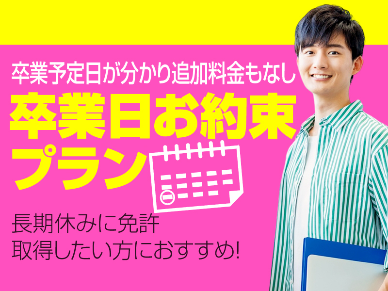 ※入校時期により卒業までの日数が異なる場合があります。お客様の通学できないお日にちがある場合、卒業日が遅くなる場合があります。また教習の進捗状況により卒業が遅くなる場合があります。